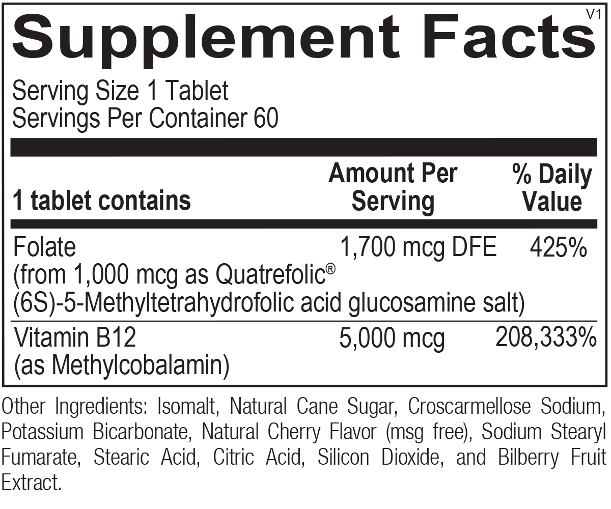 Vitamin B12 works along with folate in many body processes, including increasing metabolic energy and red blood cell production, supporting mood regulation and cognitive function, up-regulating methylation, increasing DNA synthesis and repair, and supporting the formation of the protective myelin sheath, the insulating exterior that speeds up nerve cell transmission. Most B12 supplements contain cyanocobalamin. In order for B12 to be utilized in the body, the liver must first remove the cyanide molecule and attach a methyl group to form methylcobalamin, the biologically active, tissue-ready form. Research has shown that methylcobalamin is more efficiently used and retained in the body than the cyanocobalamin form. This formulation of Methyl B12 includes a concentrated and bioavailable source of two key B vitamins: B12 and folate. Each tablet provides 5,000 mcg of methylcobalamin and 1,700 mcg of folate as Quatrefolic® -100% 5-MTHF. This synergistic blend of methyl-donating B vitamins quickly boosts tissue and brain levels to support numerous systems in the body.
